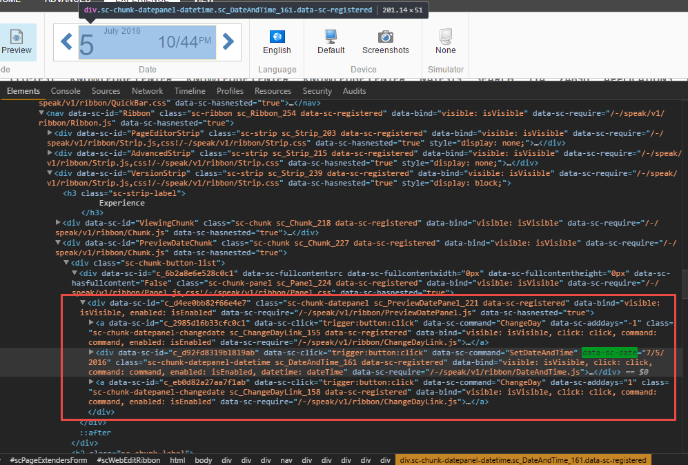 The outer <div> element is the overall panel for the preview date control. In order to generate it's control layout, it uses the JavaScript file named PreviewDatePanel.js, as defined by the data-sc-require attribute. The child <div> element (the highlighted area) is the part of the control that actually shows the date information. This has a few interesting attributes: