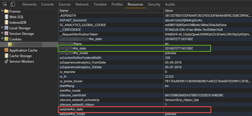 In order to verify if the preview date was stored correctly in the cookie value, I looked at the cookies stored for the site. Here, I noticed that there were not one cookie value for the sc_date cookie value, but multiple; one for mysite#sc_date and one for website#sc_date: