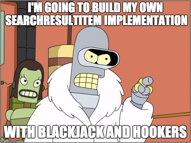 Let's see how we can create our own custom SearchResultItem implementation (disclaimer: blackjack and hookers not included). In order to do so, all we need to do is: