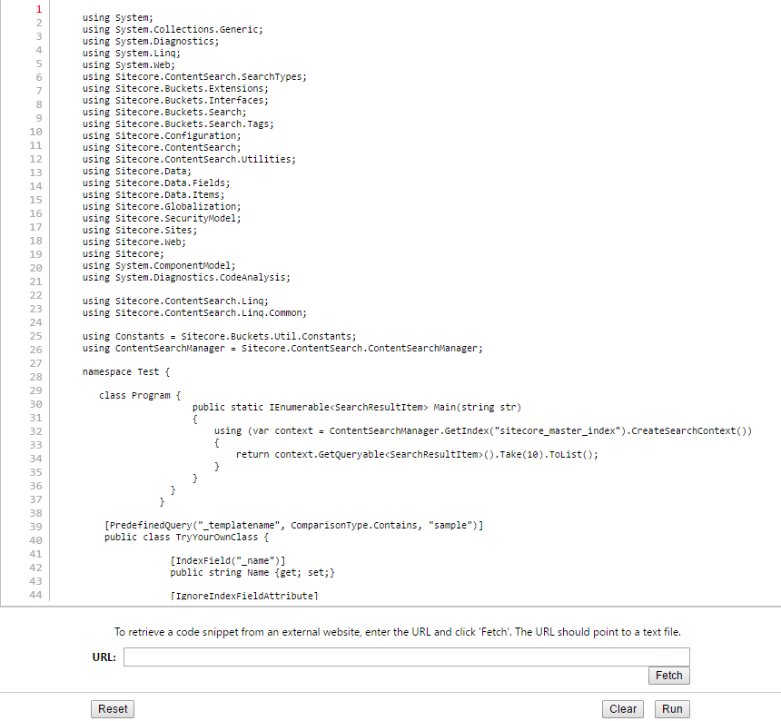 Even though I've only just shown how to use the Linq Scratchpad using the default sample code, the ability to have a way to prototype ContentSearch queries is invaluable. Imagine that you want to test out which boosting value to use, adjust the fuzziness of a similarity query or something completely different. The Linq Scratchpad makes this possible without the need to write and re-deploy your code every single time you make a change. Moreover, the Linq Scratchpad supports everything you are able to do from your custom .NET solution, there really is no limits to what you can do - if the API supports it, you can try it out.
