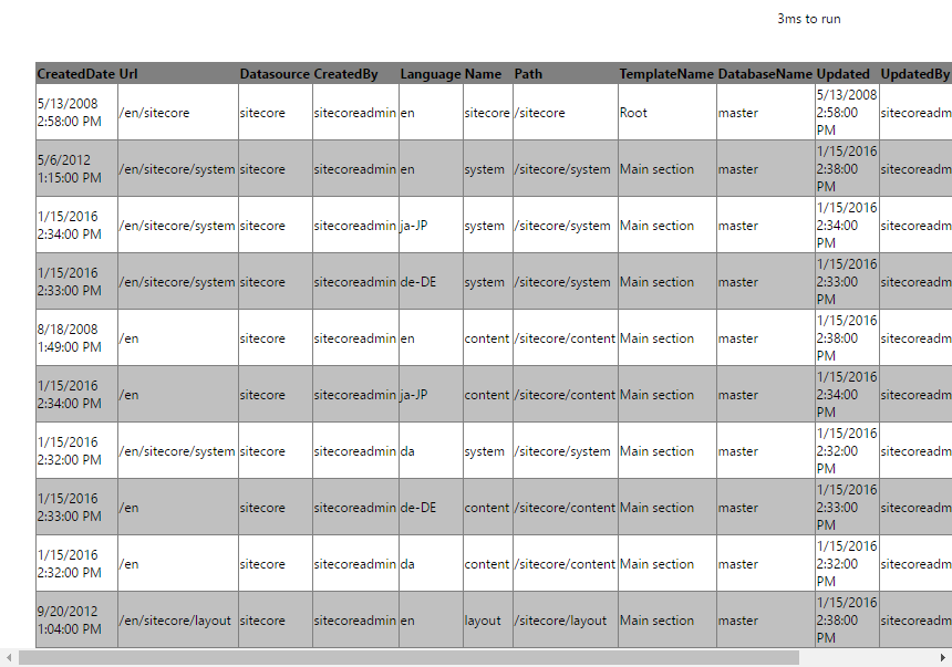 In the result list, each row is a entry from the search index and each column represents the values of the properties on the mapped return type T, which is specified on the call GetQueryable<T> method (in this case SearchResultItem). Moreover, you also get an indication on how fast (or slow) your query is, making it possible for you to see if the changes you make to your query improves or decreases the performance of your query.
